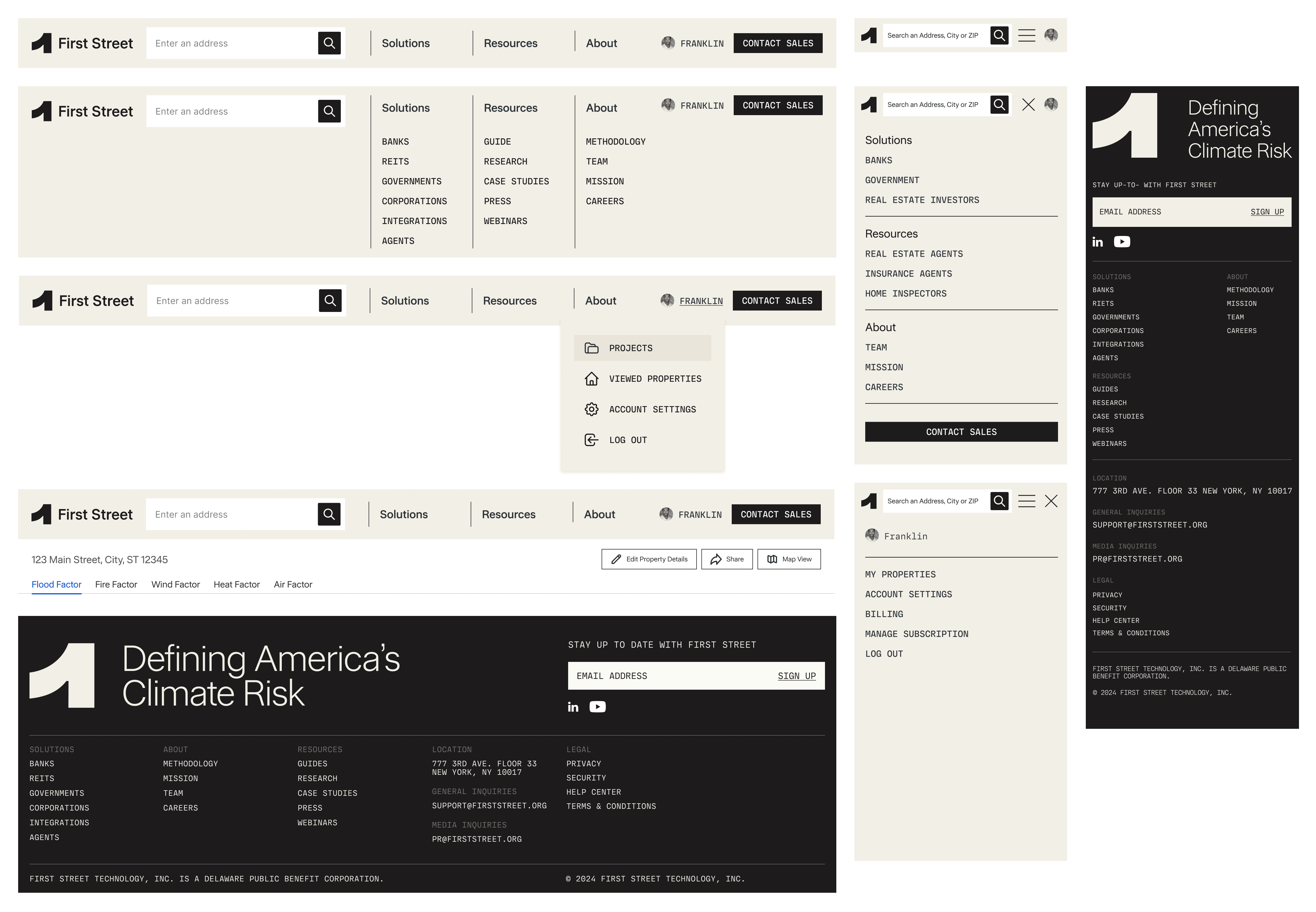 We redesigned headers and footers as shared system components, creating consistent navigation across both product and marketing surfaces. This established predictable structure and hierarchy while reinforcing First Street as a single, cohesive platform.